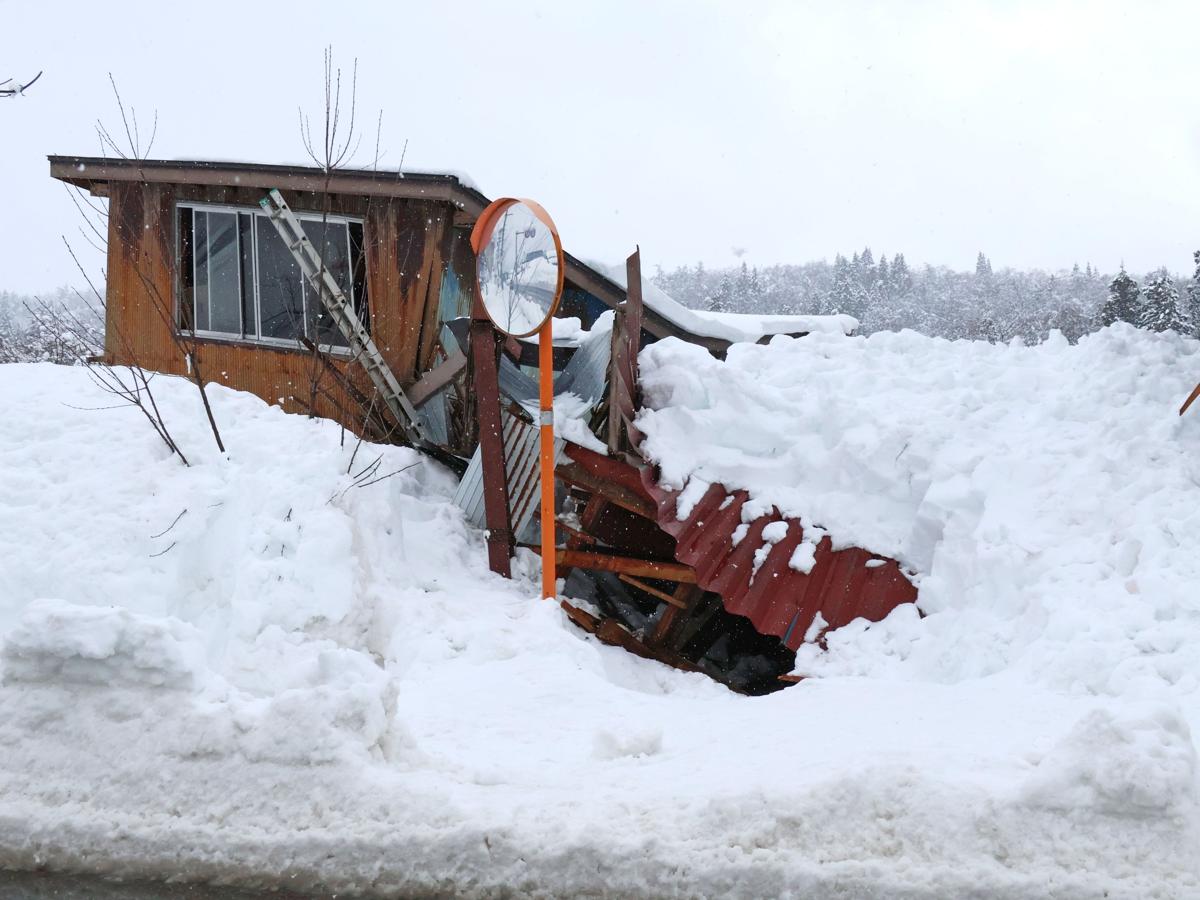 雪の重みで倒壊したとみられる住宅=3日、上越市三和区岡田