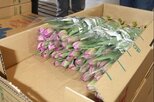 新潟県が出荷量日本一を誇るチューリップの切り花。全国に発送する際の効率化につなげようと、県内各産地の出荷用段ボール箱の規格を統一する社会実験が始まった。トラック輸送に携わるドライバー不足が課題となる中、積み替えの負担軽減を図ることで、業界挙げて輸送効率の向上を目指す。