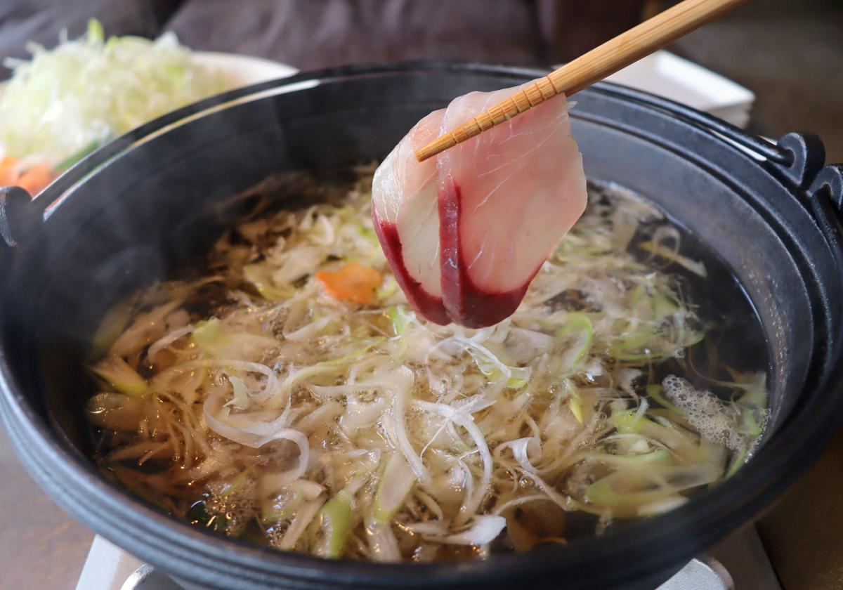 生でもおいしいブリをぜいたくにしゃぶしゃぶで提供します。火が通りやすいよう薄切りですが、濃厚さはそのまま。あごだしつゆにくぐらせて、佐渡産ネギをたっぷり巻いて食べると絶品です。