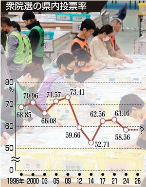 8日に投開票が迫った真冬の衆院選は最終盤を迎え、県内小選挙区の各陣営は投票率の行方に気をもんでいる。無党派層の票をどう取り込むかが各陣営の焦点の一つだが、そのためには投票率の上昇が欠かせない。高市政権の高支持率を背景に組織票に上積みしたい与党と、過去の選挙で無党派層の取り込みが奏功してきた野党の双方が投票率上昇を望む。とはいえ「冬で足元が悪く、投票日は荒天予報。下がるかもしれない」とみる向きが多い。