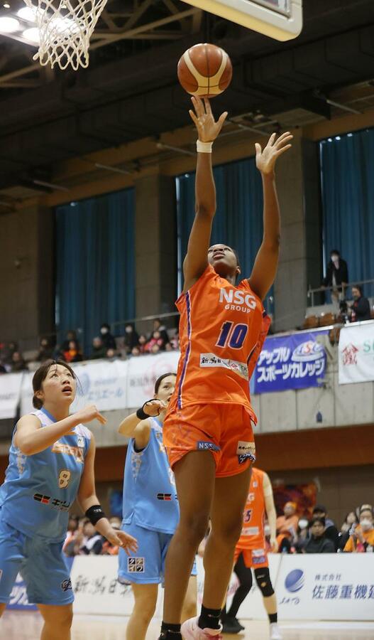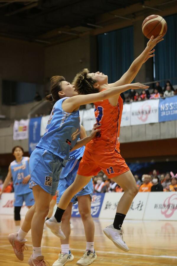 新潟の先発はデンベル、久井咲良、金沢みどり、森田真衣、中道玲夏。第1クオーターで森田が14得点してリードすると、第2クオーターもデンベルや中道が体を張ってリバウンドを奪い、39-29で試合を折り返した。