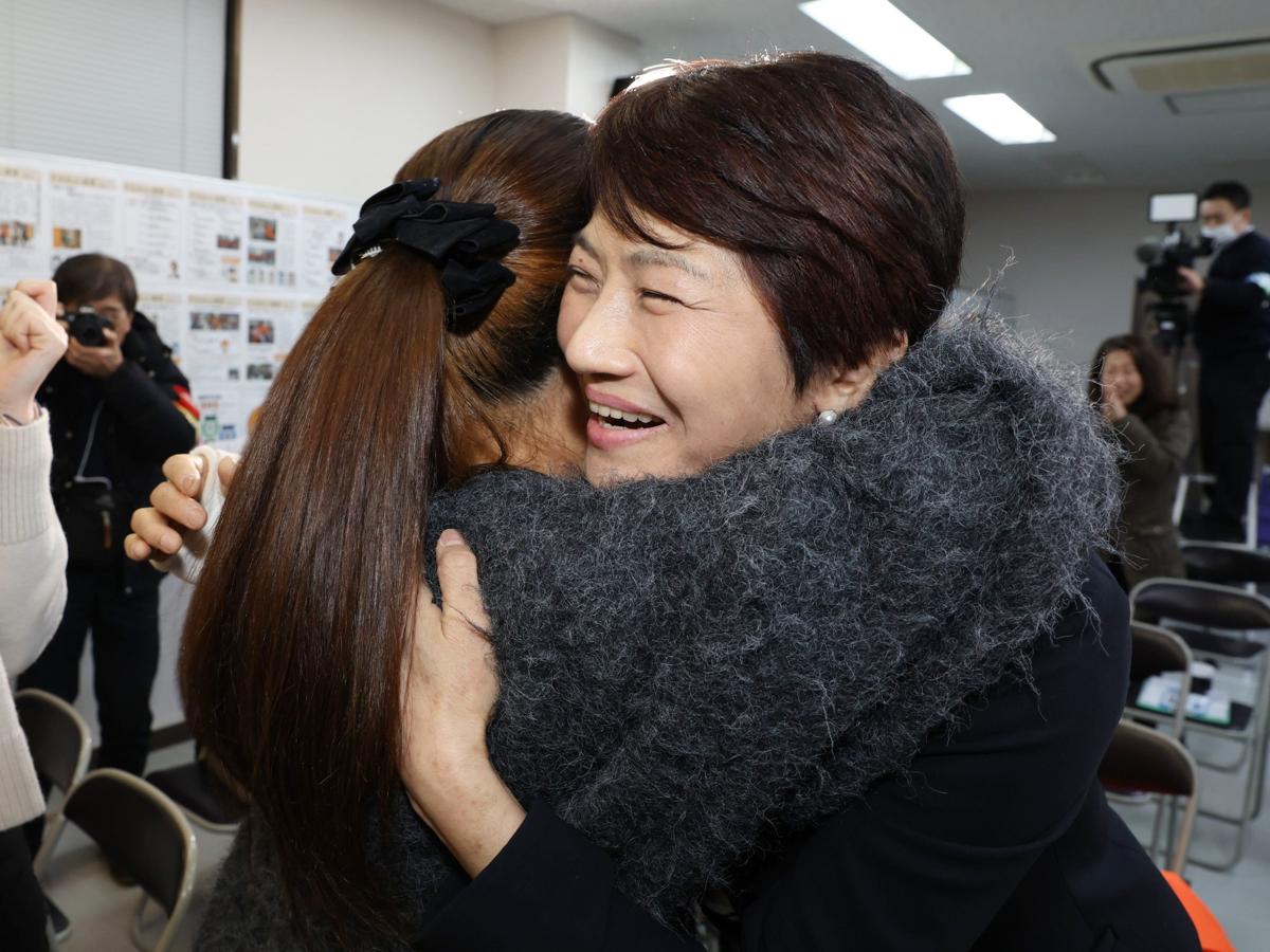 中道前職の西村智奈美さん(59)=1区=は小選挙区では敗れたが、比例で復活当選を果たした。満面の笑みで支援者と固く抱き合い「天から与えられた1議席。日本と新潟の未来のために仕事をしていく」と力強く語った。