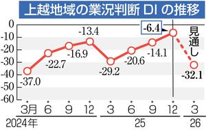 上越信用金庫(上越市)は、上越地域の10〜12月期の中小企業景気動向調査をまとめた。景況感を示す業況判断DIは、前期から7・7ポイント改善し、マイナス6・4となり、3期連続で改善した。対象6業種のうち4業種で改善し、上越信金は「忘年会など飲食関連の人出が回復傾向で、自動車関連の需要も好調だった」としている。来期(1〜3月期)は、冬季で工事の受注減や人出が減るため、マイナス32・1を見込む。