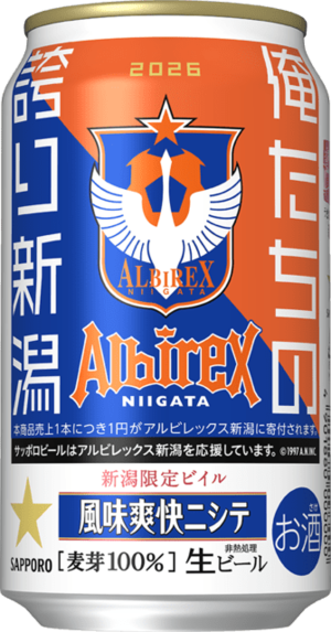 サッポロビールは9日、「新潟限定ビイル 風味爽快ニシテ アルビレックス新潟缶」を、10日に新潟県内で数量限定発売すると発表した。チームカラーのオレンジとブルーを背景にエンブレムを大胆に描き、「俺たちの誇り新潟」と、新潟愛を前面に打ち出している。