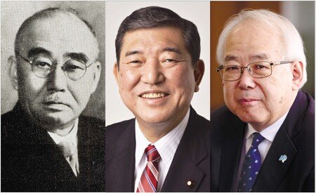 左から石橋 湛山(第55代内閣総理大臣、第16代立正大学 学長)、石破 茂 氏(第102,103代内閣総理大臣、衆議院議員)、北村 行伸(立正大学 学長)