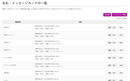 一度作成したレイアウトはマイページに保存でき、次回以降の注文時にワンクリックで再利用が可能です。法人利用においては、同一形式の贈答を繰り返し行うケースが多く、注文作業の効率化や表記ルールの統一化が強く求められています。本機能はこうしたニーズに直結しており、毎回内容を入力・調整する手間を省くことで、多忙な手配担当者の業務負荷を劇的に軽減します。