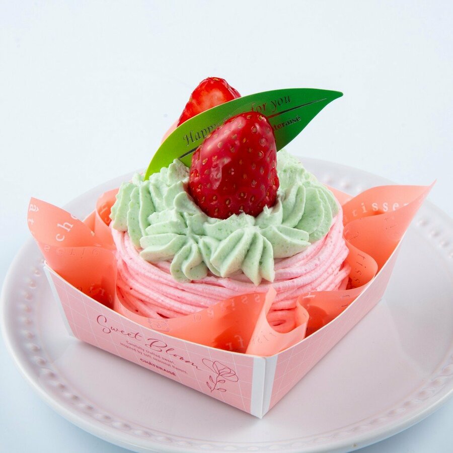 ピンクと緑の色合いで、春の訪れを感じさせる可愛らしいケーキです。スポンジに、つぶつぶ感のある苺シュガーチップ入り苺クリームと、やさしい甘さの桃ジュレを重ね、苺クリームとりんご風味クリームを絞り、苺をトッピングしました。
