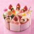 苺果肉入り苺ソースとホイップクリームをサンドしたケーキと、チョコクリームとシリアル入りチョコレートをサンドしたチョコケーキ、2種類の味が楽しめるデコレーションです。彩り鮮やかなフルーツと、カスタードクリームを入れた動物のケーキをのせ、見た目にも楽しい仕上がりに。お子さまの笑顔が広がる、桃の節句のお祝いにぴったりのケーキです。