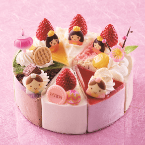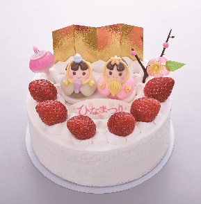 ひなまつりに欠かせない伝統的なお菓子「ひし餅」をイメージした、彩り豊かで華やかなデザインのケーキです。かわいらしいピンク色と緑色のスポンジで、ホイップクリームと苺をサンドし、苺や雛人形チョコレート、桃の花、ぼんぼりを飾りました。やさしい甘さのホイップクリームと苺の味わいが楽しめます。