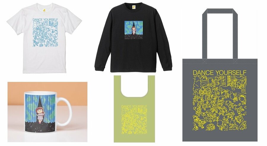 左上から時計回りにDANCE YOURSELF Tシャツ、Hello Universe ロングTシャツ、DANCE YOURSELF トートバッグ、DANCE YOURSELF エコバッグ、Hello Universe マグカップ