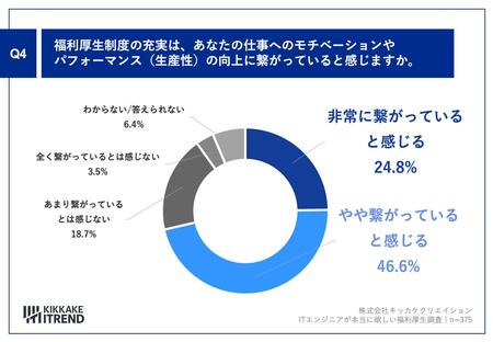 「Q4.福利厚生制度の充実は、あなたの仕事へのモチベーションやパフォーマンス(生産性)の向上に繋がっていると感じますか。」(n=375)と質問したところ、「非常に繋がっていると感じる」が24.8%、「やや繋がっていると感じる」が46.6%という回答となりました。