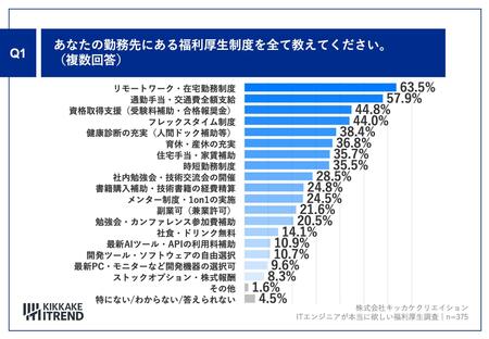「Q1.あなたの勤務先にある福利厚生制度を全て教えてください。(複数回答)」(n=375)と質問したところ、「リモートワーク・在宅勤務制度」が63.5%、「通勤手当・交通費全額支給」が57.9%、「資格取得支援(受験料補助・合格報奨金)」が44.8%という回答となりました。