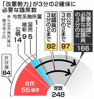 政治・行政 選挙 参院選2022 [参院選のミカタ]改憲勢力 125議席のうち、到達ラインは82 2022/6/23 0:01 (最終更新: 2022/6/24 20:40) 参院選では、憲法改正に前向きな「改憲勢力」が国会発議の要件「総議員の3分の2以上」を確保するかどうかが焦点の一つとなる。今回争う計125議席(欠員を含む)のうち、82議席が必要だ。岸田文雄首相(自民... 残り475文字(全文:575文字) ここから先を読むには 続きを読む(会員登録する) 続きを読む(ログイン) 新潟日報朝刊を購読していますか? はい いいえ トップページで最新情報を見る 関連ニュース 新潟県選管、参議院選挙の「投開票速報」を訂正 2022/7/14 連載[参議院選挙新潟選挙区・分水嶺の激闘]<下>立民 野党間... 2022/7/13 参院選、自民8年ぶり上越市で勝利 240票差、与野党勢力図に変化も 2022/7/13 参議院選開票結果、「衆議院新区割り」だとどうなる? 新潟選挙... 2022/7/13 立民西村幹事長、共闘へ溝埋められず 参院選で議席減 2022/7/13 連載[参議院選挙新潟選挙区・分水嶺の激闘]<上>自民 挙党態... 2022/7/12 参議院選挙比例代表で落選の水落敏栄氏、引退撤回から挑むも支持... 2022/7/12 参院選新潟選挙区 無党派層が勝敗左右か 戦いを振り返る 2022/7/11 安倍元首相銃撃事件後、小林氏の得票増 参院選・期日前出口調査 2022/7/11 柏崎刈羽原発再稼働「反対」減少も4割超 「賛成」は増加 参院... 2022/7/11 比例代表個人名得票 公明・竹内真二氏がトップ 参院選・新潟県内 2022/7/11 比例代表政党名得票 自民が全市町村で最多 参院選・新潟県内 2022/7/11