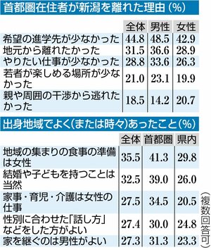 新潟県は人口が流出する転出超過が深刻だ。中でも20代で目立ち、女性の方が多い。県は昨年11月、18〜39歳で首都圏に住む400人と県内在住の400人に、県外に出た理由や出身地域での性別役割分担意識などを尋ねた。