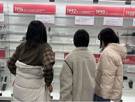 また、展示コーナーでは、入口にある初期の携帯電話に皆がわっと集まり、興味津々。歴代の電話の展示に「こんなにあるの?!」とびっくりしたり、「昔の電話おもしろい!このダイヤルまわしてみたい!」などと話しながら展示コーナーを見てまわる、楽しそうな子どもたちの姿がありました。