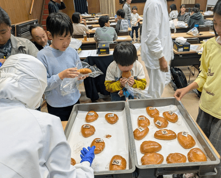 最後に、子どもたちが作った焼きたてパンがテーブルに並べられました。「おいしい!」という第一声を受け、次々と子どもたちが美味しそうにかぶりつく様子に、社員の方々も思わずにっこり。子どもたちも、社員の方々も、当金庫職員も皆が笑顔と充実感であふれた一日となりました。