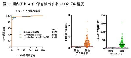 認知機能正常の方、軽度認知障害(MCI)、軽度ADからなる172人の方の血漿検体を用いてp-tau217をルミパルス免疫測定法とSimoa HD-Xを用いて測定しました。また、血液中のAβ42の測定を行い、p-tau217/Aβ42比を算出しました。