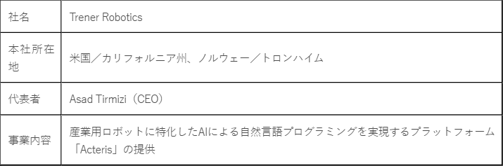 Trener Roboticsは、産業用ロボットに特化したAIによる自然言語プログラミングを実現するプラットフォーム「Acteris」を提供する企業です。自然言語での指示をActerisがロボット動作に変換するため、従来のコードベースのプログラミングが不要です。また、Acterisは生産現場の各工程を事前学習したスキルモデルを提供し、複雑で変動の多い生産工程の自動化に貢献するため、高度な産業オートメーション化を加速します。