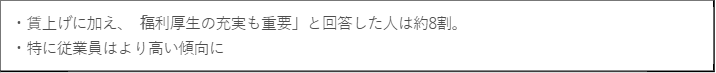 物価高による生活不安が続く中、賃上げと並行して福利厚生の充実を求める声が高まっていることがうかがえます。