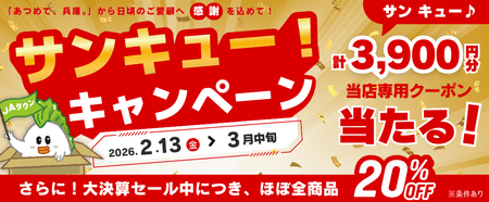 JA全農兵庫が運営する、産地直送通販サイト「JAタウン」内のショップ「あつめて、兵庫。」では、2026年2月13日~3月中旬まで、日頃のご利用に感謝を込めて「サンキュー!キャンペーン」を実施します。「あつめて、兵庫。」ショップ内の対象商品ページに設置の 20%OFFクーポンをその場で使用することでお得にお買い物できる他、期間中当ショップご利用の会員様の中から抽選で200名様に2026年4月以降に使用可能な合計3,900円分の当ショップ専用クーポン(2026年4月~6月に各月1,300円ずつ利用可能)をプレゼントいたします。