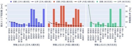 <日本人観光客・外国人観光客・地元住民の移動傾向:外国人観光客は距離の長い移動の割合が多い>
