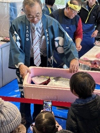 本企画は、1月25日に実施した解体ショーが大変好評を博したことを受け、追加開催が決定したものです。前回は、佐渡市長、阿賀野市長にもご来場いただき、会場には立ち見が出るほどの盛況となりました。目の前で繰り広げられる迫力ある解体の様子と、佐渡の海の幸をその場で味わえる特別感に対し、ご家族連れからご年配の方まで、幅広い世代の来場者から高い評価をいただきました。