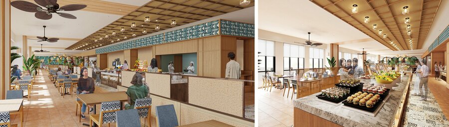 「世界の食を旅するレストラン」をテーマに、多国籍ブッフェの朝食をご用意。ソファ席も多く配した明るいリゾート空間で家族や仲間との会話も弾みます。