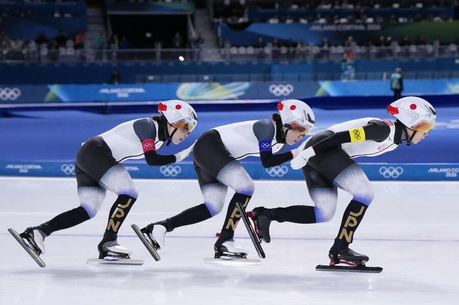 ミラノ・コルティナ冬季五輪のスピードスケート女子団体追い抜き3位決定戦で滑走する(左から)高木美帆、野明花菜、佐藤綾乃。銅メダルを獲得した=17日、イタリア・ミラノ(共同)