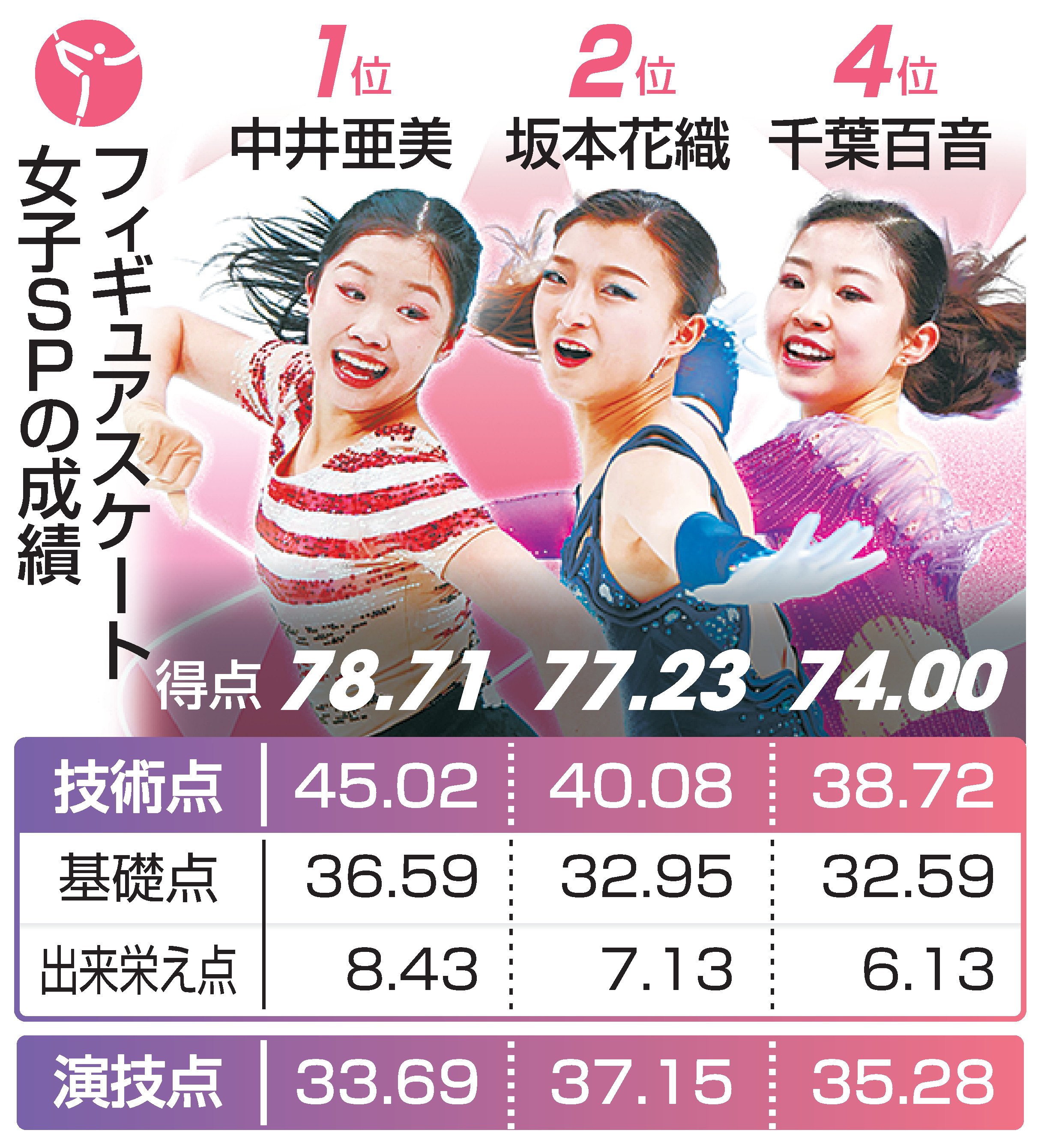 ミラノ・コルティナ冬季五輪第12日の17日、女子ショートプログラム(SP)で、初出場の17歳、中井亜美(TOKIOインカラミ)がトリプルアクセル(3回転半ジャンプ)に成功して自己ベストの78・71点で首位に立った。前回北京五輪銅メダルの坂本花織(シスメックス)は77・23点で2位、初代表の千葉百音(木下グループ)は74・00点で4位につけた。