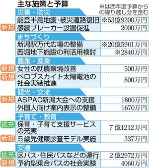 新潟市が16日に発表した2026年度一般会計当初予算案では、能登半島地震からの復旧・復興を最優先課題の一つに掲げたほか、まちづくりや産業、子育てなど幅広いテーマで新たな事業に着手し、地域の活力向上や持続可能性の確保を図る方針が示された。市が力を入れる主な事業を分野別に紹介する。