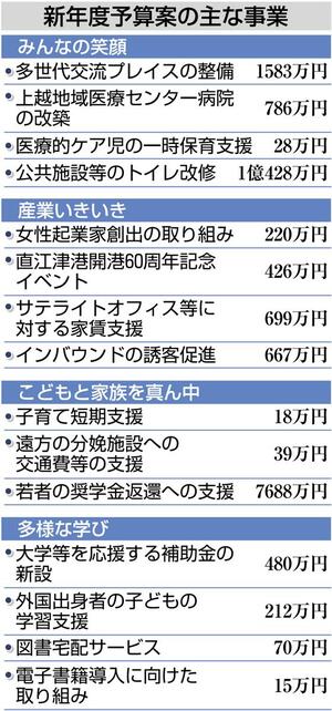 上越市は17日、2026年度当初予算案を発表した。一般会計の総額は1084億1355万円で、25年度当初に比べ58億4580万円(5・7%)増え、3年連続で増額した。昨年11月に就任した小菅淳一市長にとって初めての編成で、公約に掲げた「こどもセンター」を多世代の交流施設として整備するなど、地域振興や子育て環境の充実を図った。