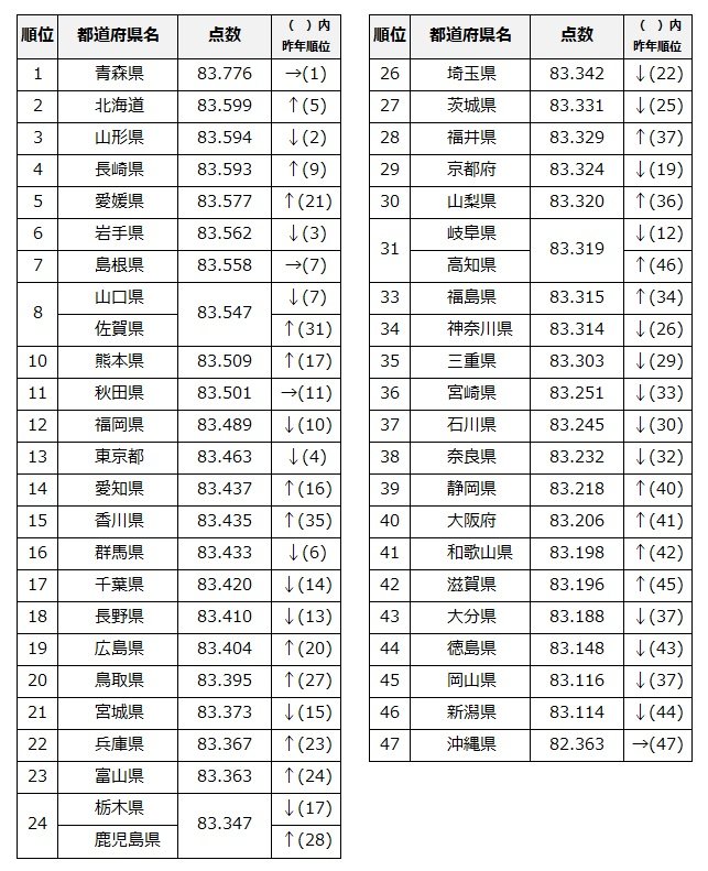 3位が山形県(昨年2位)となりました。1位の青森県と最下位の沖縄県は昨年と同様の結果でしたが、2位から46位は順位が大きく入れ替わりました。