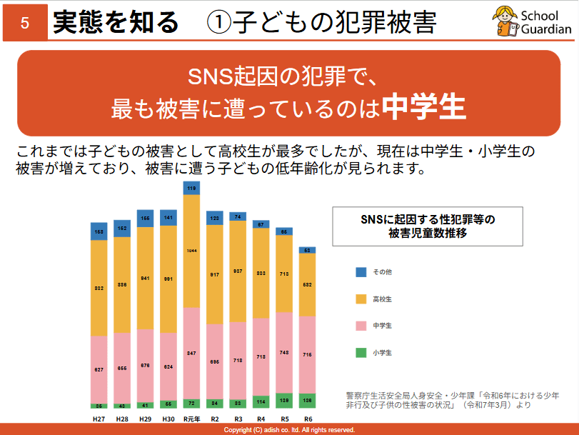 SNSに起因する犯罪被害は後を絶たず、特に小学生、中学生の被害が増加しており、被害に遭う子どもの低年齢化が見られています。(※1)