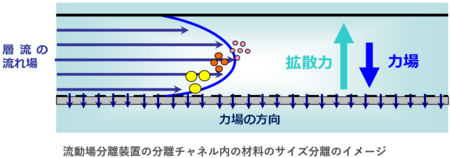 狭い流路に沿った乱れのない流れ(層流)によって流れるさまざまなサイズの材料が、流れの垂直方向の一定の力場(流れ場や遠心場など)と、材料のサイズに依存した拡散力とのバランスの違いに応じた分離を行う手法を指す。