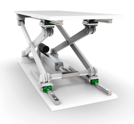 シザーリフト式テーブル機構への組み込み例:リニアアクチュエーター「EWELLIX EMA‑80M」