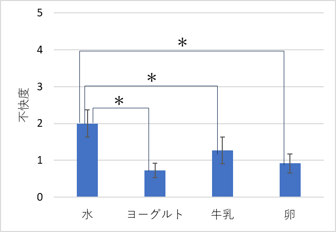 自己評価:不快感 (平均値±標準誤差、*:有意差ありp<0.05)
