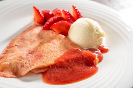 温かいクレープにカットしたいちごを添え、アイスクリームはお好みでトッピングできるクレープシュゼット。