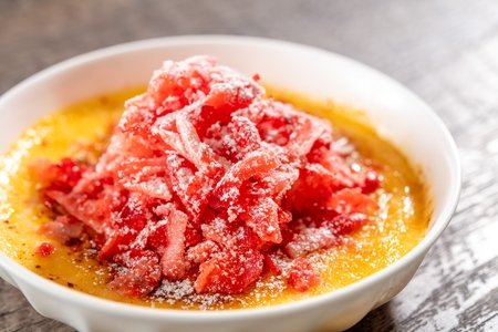 「マスカルポーネのクレームブリュレ いちごのコンジュレを添えて」