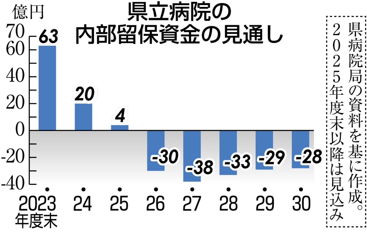 県病院局は19日までに2026年度病院事業会計予算案を発表し、45億円の赤字見通しを明らかにした。機器の購入や赤字補塡(ほてん)などに充てる内部留保資金が26年度末に30億円不足する恐れがあり、財源不足を補う資金手当債を30億円発行する。病院局の資金手当債発行は初めて。