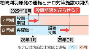 設置が義務付けられた原発のテロ対策施設を巡り、原子力規制委員会は設置期限の延長に向けた検討を始めた。東京電力柏崎刈羽原発7号機は、現行ルールでは施設が完成予定の2029年まで運転できないが、新ルールにより早まる可能性がある。ただ、既に設置期限が過ぎた7号機が適用対象になるかどうかは不透明だ。