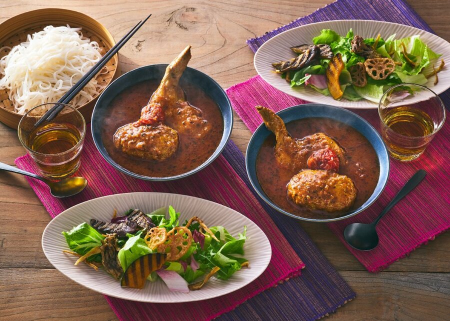 十種類以上のスパイスとハーブを使ったトマトベースのスープカレーは、ドライバジルの味わいがアクセント。具材には、骨付きチキンレッグとハンバーグを組み合わせ、食べ応えある一杯に仕上げました。合わせる野菜は、生・焼き・揚げと三つの調理法を使い分け、その美味しさをスープカレーと一緒に味わえます。特に葉野菜は、スパイスの刺激をほどよくやわらげつつ、食感も楽しめます。さらに、最後にフォーを加えることで、スパイスの香りや風味をより楽しんでいただけます。