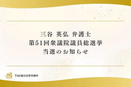 TMI総合法律事務所(所在地:東京都港区、代表:田中 克郎)は、このたび、三谷 英弘 弁護士が、令和8年2月8日に執行された第51回衆議院議員総選挙において、神奈川8区(横浜市緑区・青葉区)より当選しましたことをお知らせいたします。