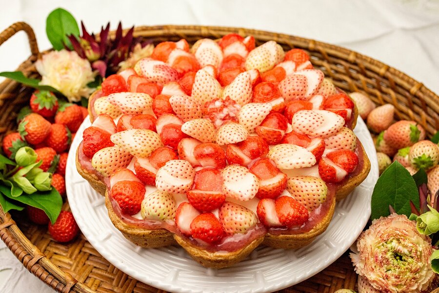アッサムを合わせたアーモンドクリームにミルクティームースを流し、白イチゴ“初恋の香り”と“桃薫”を華やかに飾りました。2種類のブランドイチゴとミルクティーの組み合わせが新鮮です。