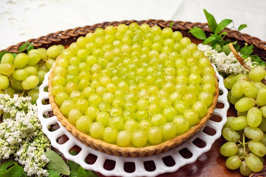 皮が薄くサクサクとした食感と、ジューシーで甘酸っぱい味わいが特徴のトンプソンをタルト一面に飾り、さっぱりとしたサワークリームとカスタードクリームをあわせました。