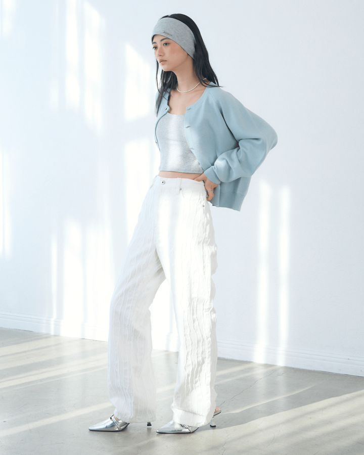 パンツはやや腰上のハイウエストでウエスト周りはスッキリとし、深めの股上のためスタイルアップも叶います。