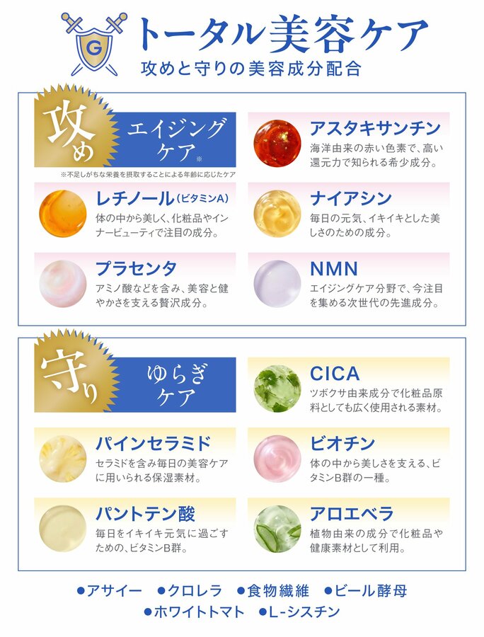 ・その他:アサイー、クロレラ、食物繊維、ビール酵母、ホワイトトマト、L-シスチン