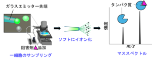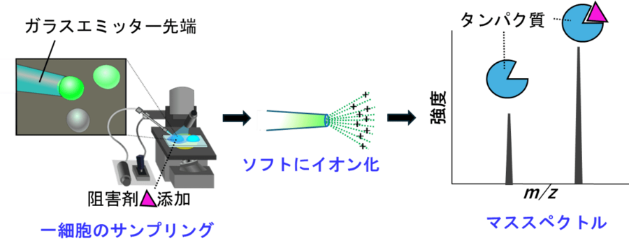 目的タンパク質を過剰発現しているヒト培養細胞に、そのタンパク質に対する阻害剤を浸透させた後、生きている細胞を1つだけサンプリングしてネイティブ質量分析することで、タンパク質―薬物複合体を観測できた