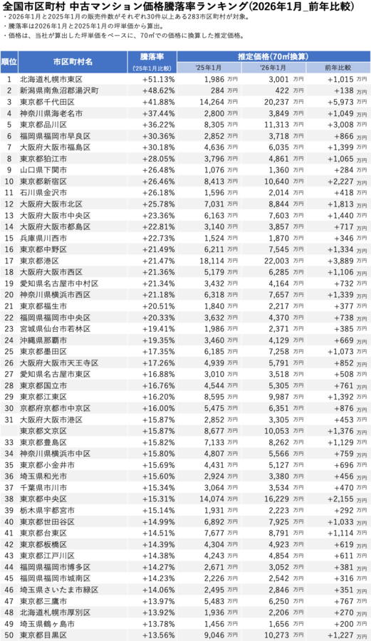 【全国市区町村 中古マンション騰落率ランキング(2026年1月)】