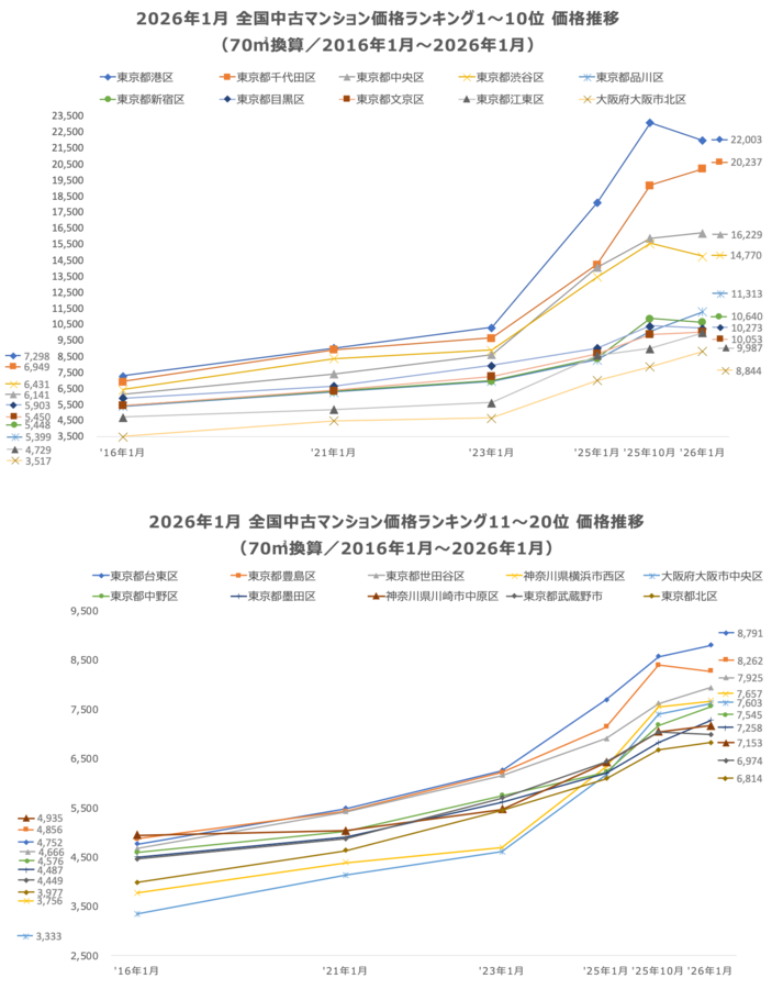 「不動産×WEB×ビッグデータ」の領域で、さまざまな不動産テックサービスを展開する株式会社ワンノブアカインド(本社:東京都港区、代表取締役社長:川島 直也、以下当社)は、当社が運営するマンション情報サイト「マンションレビュー」の保有データを元に、2025年12月の全国市区町村における中古マンションの相場を調査。坪単価をベースに70㎡の価格に換算した「中古マンション価格」*1と価格ランキング上位20件について過去10年間の価格推移、および1年前からの価格上昇率を表す「騰落率」のランキングを発表いたします。