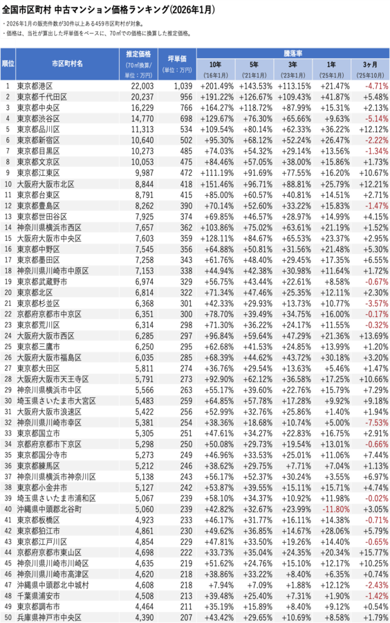 【全国市区町村 中古マンション騰落率ランキング(2026年1月_3・5・10年前比較)】